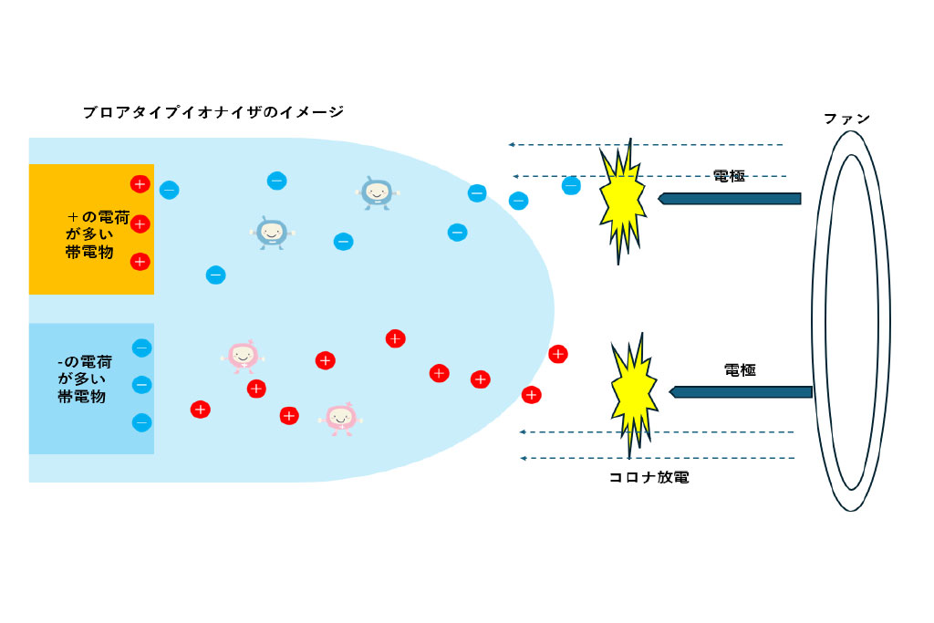 もしイオンバランスが崩れ、例えばプラスイオンばかりが多く放出されると、マイナスに帯電した物体は除電できますが、もともと帯電していなかった物やプラスに帯電していた物は、逆にプラスに帯電してしまいます。