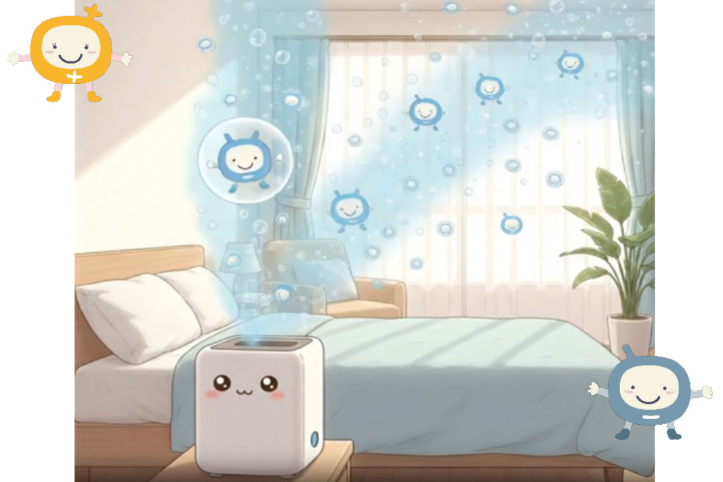 空間に浮遊するウイルス・カビ菌・アレル物質(花粉、ダニのフンなど)の活動を抑制する作用が期待されています。
