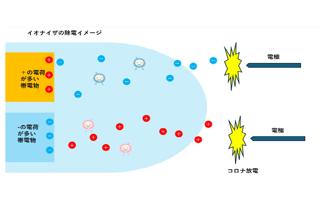 半導体工場など、わずかな静電気でも製品不良につながる現場では、「イオナイザー」と呼ばれる装置で常にイオンを発生させ、静電気を徹底的に除去しています。