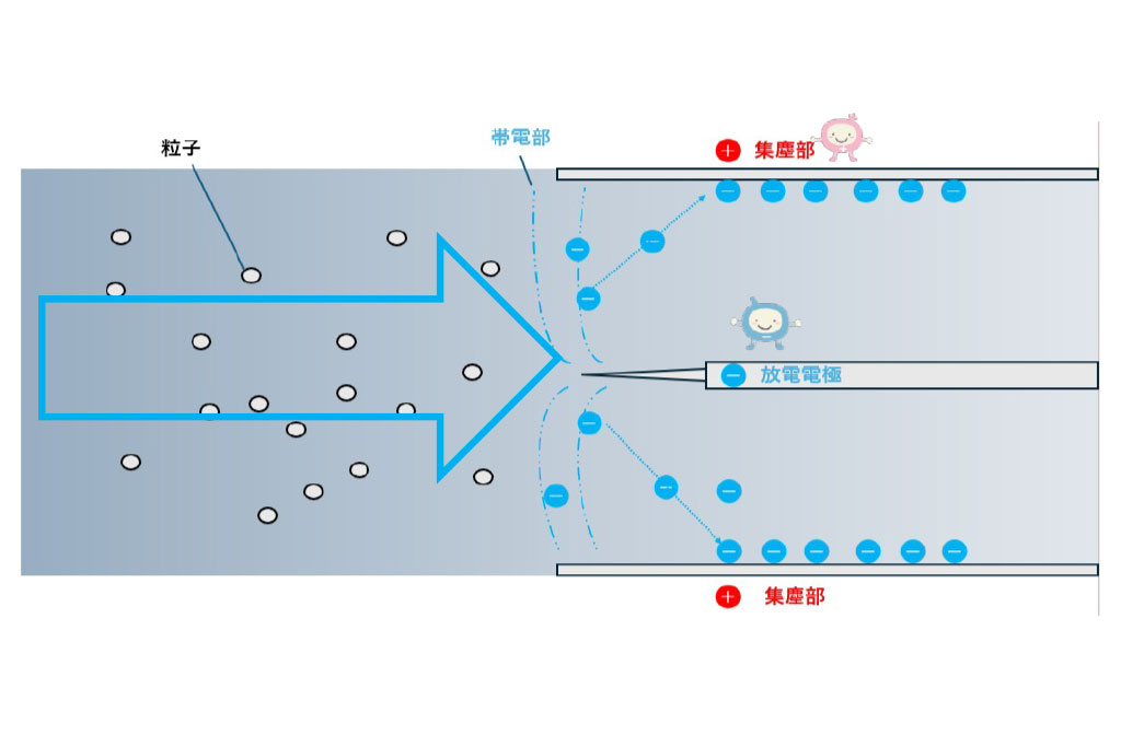 【放電 → 帯電 → 捕集】というプロセスで、空気中の微粒子を除去する。